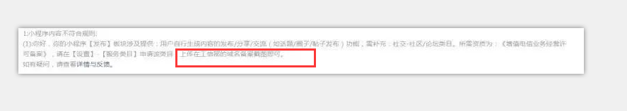 你好,经核实,贵方小程序【发布】板块涉及提供:用户自行生成内容的发布/分享/交流(如话题/圈子/帖子发布)功能,需补充:社交-社区/论坛类目。所需资质为:《增值电信业务经营许可备案》,请在【设置】-【服务类目】申请该类目,上传在工信部的域名备案截图即可。