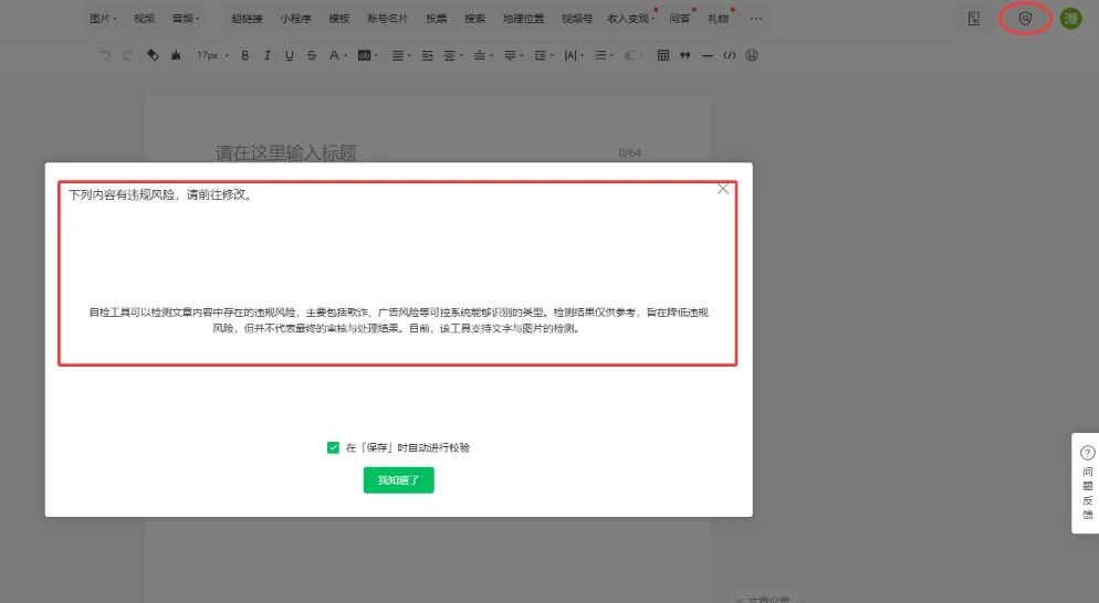发现后台多了一个这个类似于自检的图标,点击后打开是下列内容有违规风险,请前往修改,又没说哪个地方有违规。。很是蒙圈,另一个帐号后台却没有这个图标,是怎么回事