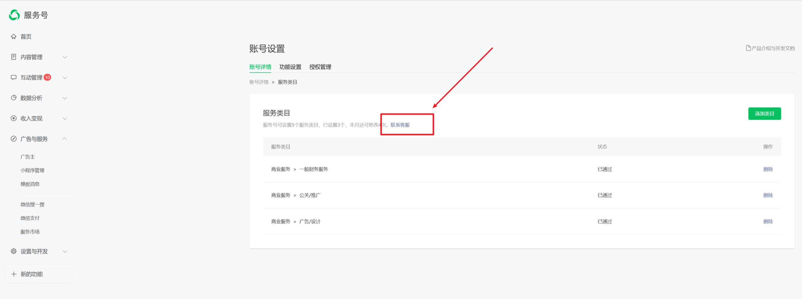 在服务类目那里,找到联系客服,咨询下客服,确认需要开通的类目