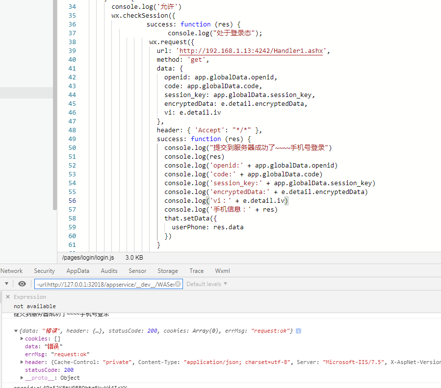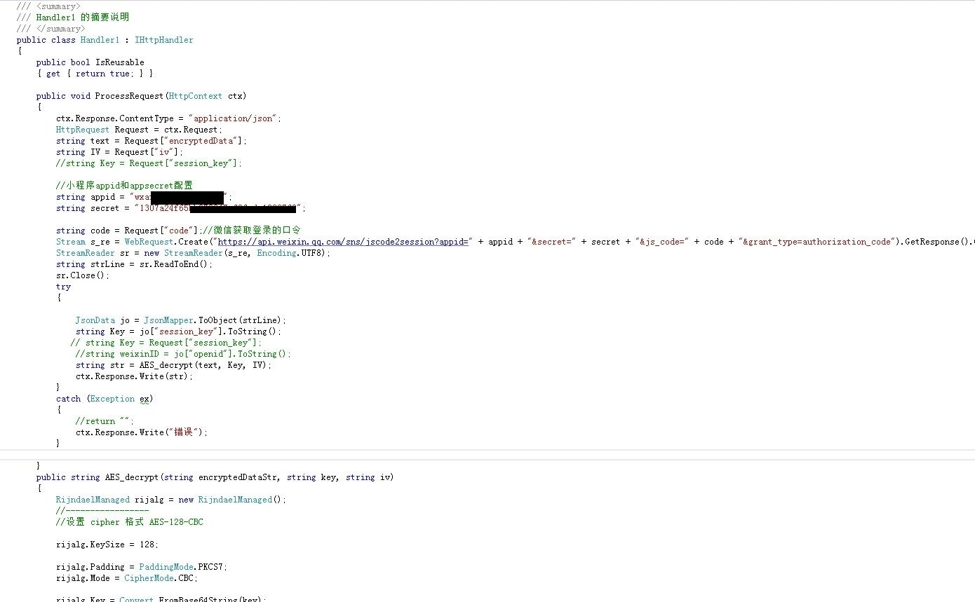 运行时出现没有办法执行try 里面数据输出,而是执行了.net 的错误catch信息。我的小程序代码有问题不?小程序代码写在login.js ,app.js 获取用户信息,然后传到login,再提交到.net ,如果那位兄弟有.net 解密源码,给一份感谢。 41501817@qq.com