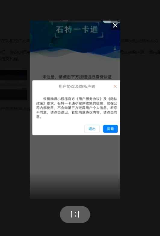 然后我根据这个原因,给小程序添加了用户隐私声明,再次提交审核,结果通过了。之后的11月24日、11月27日没动过隐私声明相关代码,分别提交了审核,也都得到了通过。在11月29日,没动过隐私声明相关代码的前提下提交代码审核时又被退回了,原因仍是要求增加《用户服务协议》及《隐私政策》,通知里有链接,我给驳回了,结果驳回有效,代码也通过审核了。之后到12月25日的7次提交代码审核也是通过,到了25日就不给通过了也是同样原因,要求增加《用户服务协议》及《隐私政策》,但是通知里没有链接了,导致我无法驳回。12月25日-12月27日一共提交审核了6次,前5次都是以要求增加《用户服务协议》及《隐私政策》为由退回审核,第6次就说了个存在功能控件无响应或不可用问题,我这边反反复复的测试了N次,能够触发弹出用户隐私声明窗口。