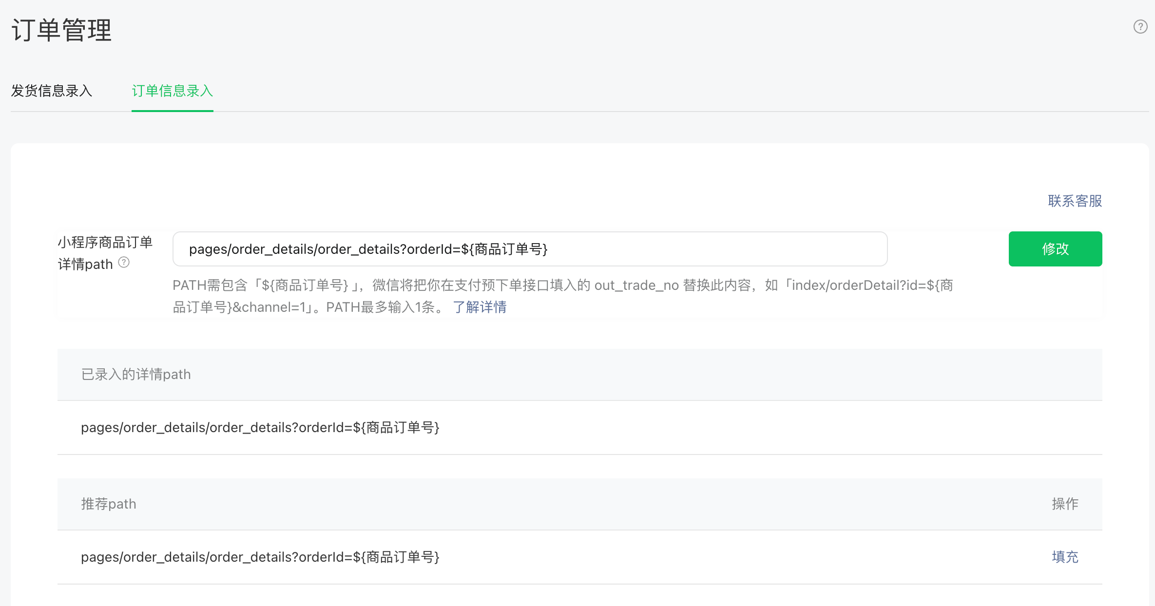 基于小程序购物订单文档,我们在小程序管理平台-支付与交易-订单管理-订单信息录入中做了如下配置:
