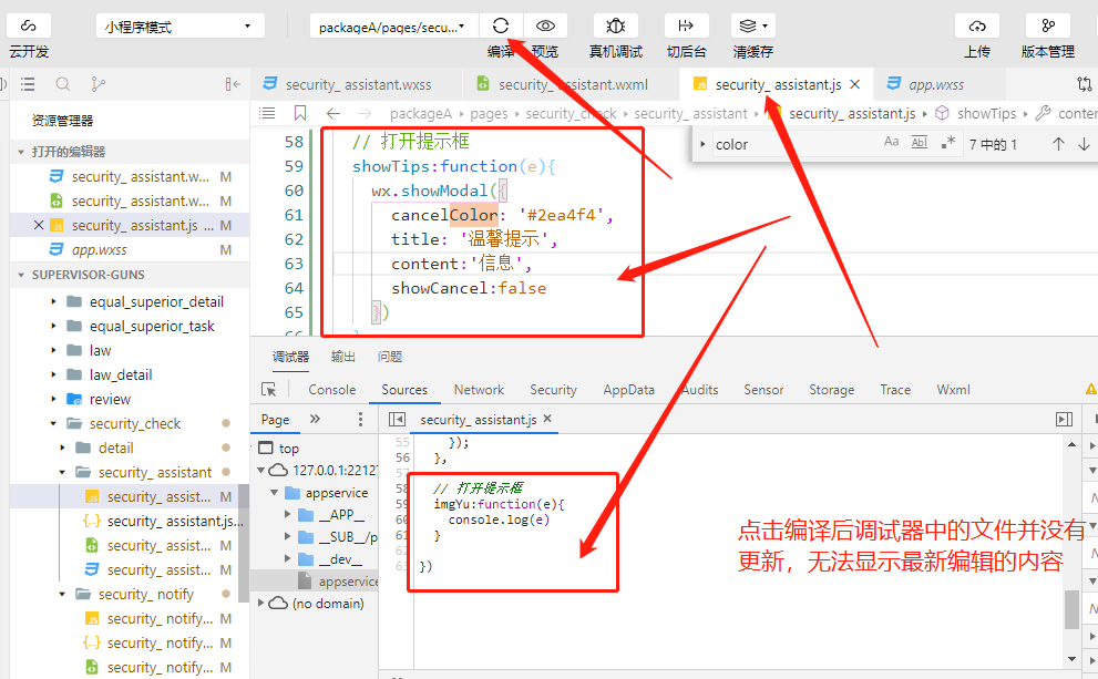你点编译只是编译,但是调试器里还是上次调试运行的实例。编译后的实例相关页面你没有重新进入,所以并没有运行起来到调速器里,你需要重新运行,人工点击进入相关页面后调试器里面的source才是最新的代码