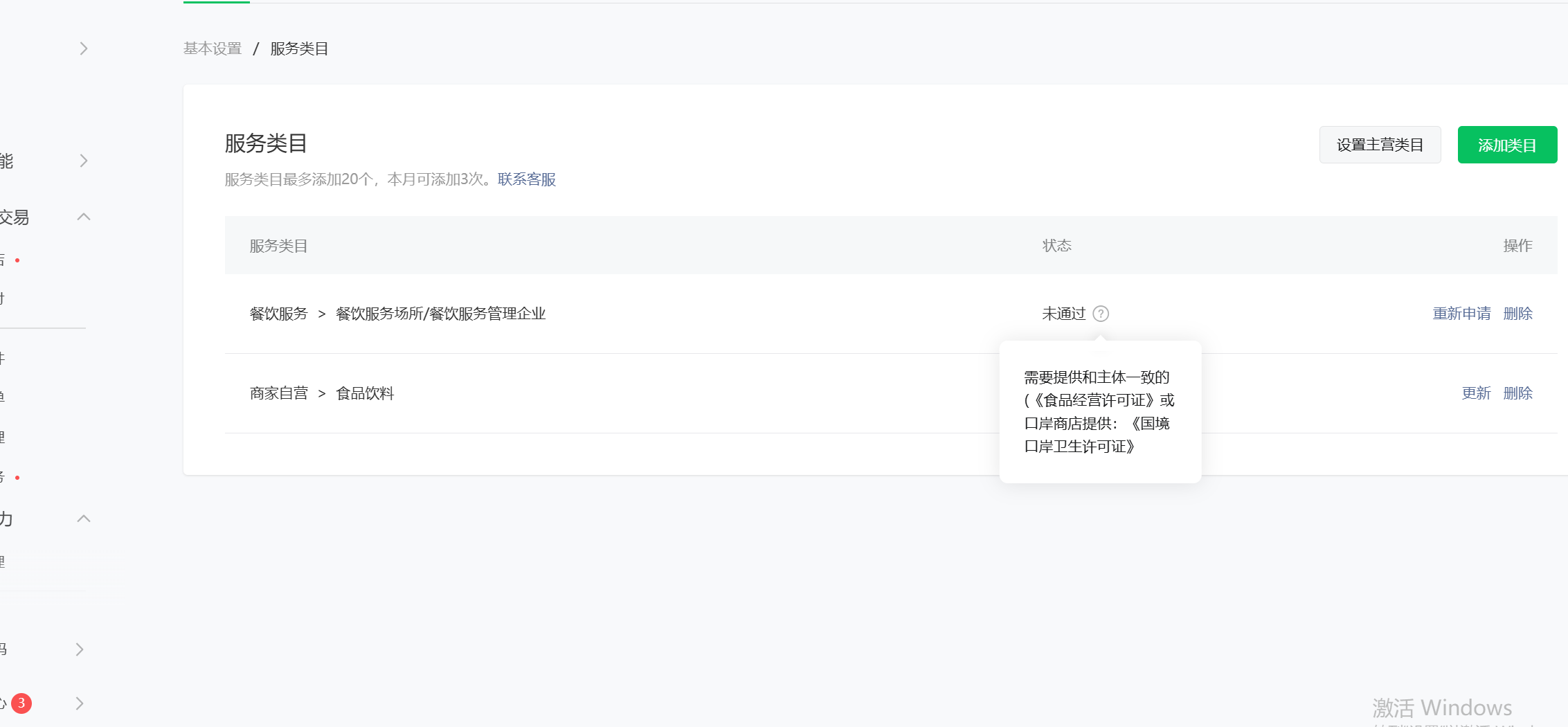 申请服务类目用了:《餐饮平台与门店的管理关系声明》及《微信小程序餐饮门店运营资质和责任承诺函》(含旗下所有门店名单)及旗下有资质门店的《食品经营许可证》,这种方式,但是审核不同过,居然提示我用另外2种方式申请