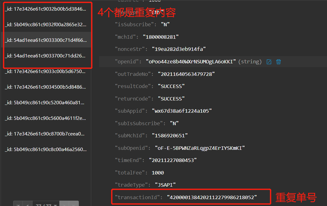 为什么云开发的支付 成功后老是重复返回呢?这个是调用完存储的云函数 这四个都是重复数据 相当于用户支付成功后回调调用了好多遍 这次调用了接口六遍......已经涉及到正常使用了 之前出现过然后限制完 过了一段时间又出现了.... 请大家帮我看看 是代码写的有问题吗?还是别的问题