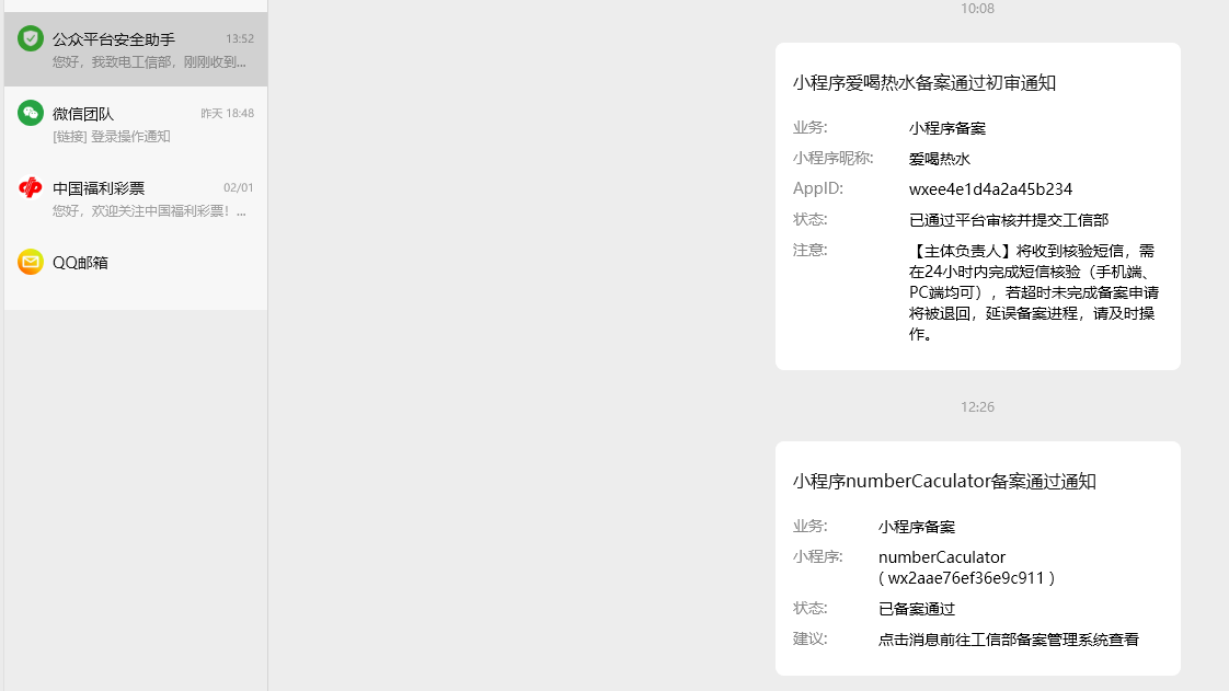 您好,我致电工信部,刚收到的备案通过验证码是小程序“爱喝热水”的,而公众平台安全助手告知"numberCaculator"备案通过。烦请检查。谢谢!