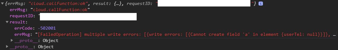 "[FailedOperation] multiple write errors: [{write errors: [{Cannot create field 'a' in element {userTel: null}}]}, {<nil>}]; "