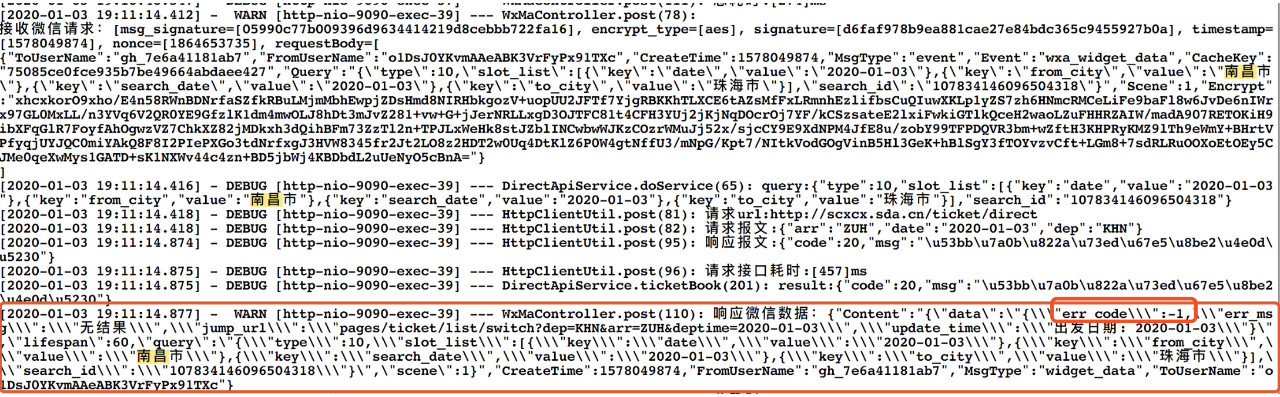 {"Content":"{\"data\"\"\\\"err_code\\\":-1,\\\"err_msg\\\"\\\"无结果\\\"\\\"jump_url\\\"\\\"pages/ticket/list/switch?dep=KHN&arr=ZUH&deptime=2020-01-03\\\"\\\"update_time\\\"\\\"出发日期: 2020-01-03\\\"\"\"lifespan\":60,\"query\"\"\\\"type\\\":10,\\\"slot_list\\\":[{\\\"key\\\"\\\"date\\\"\\\"value\\\"\\\"2020-01-03\\\"},{\\\"key\\\"\\\"from_city\\\"\\\"value\\\"\\\"南昌市\\\"},{\\\"key\\\"\\\"search_date\\\"\\\"value\\\"\\\"2020-01-03\\\"},{\\\"key\\\"\\\"to_city\\\"\\\"value\\\"\\\"珠海市\\\"}],\\\"search_id\\\"\\\"107834146096504318\\\"\"\"scene\":1}","CreateTime":1578049874,"FromUserName":"gh_7e6a41181ab7","MsgType":"widget_data","ToUserName":"o1DsJ0YKvmAAeABK3VrFyPx91TXc"}