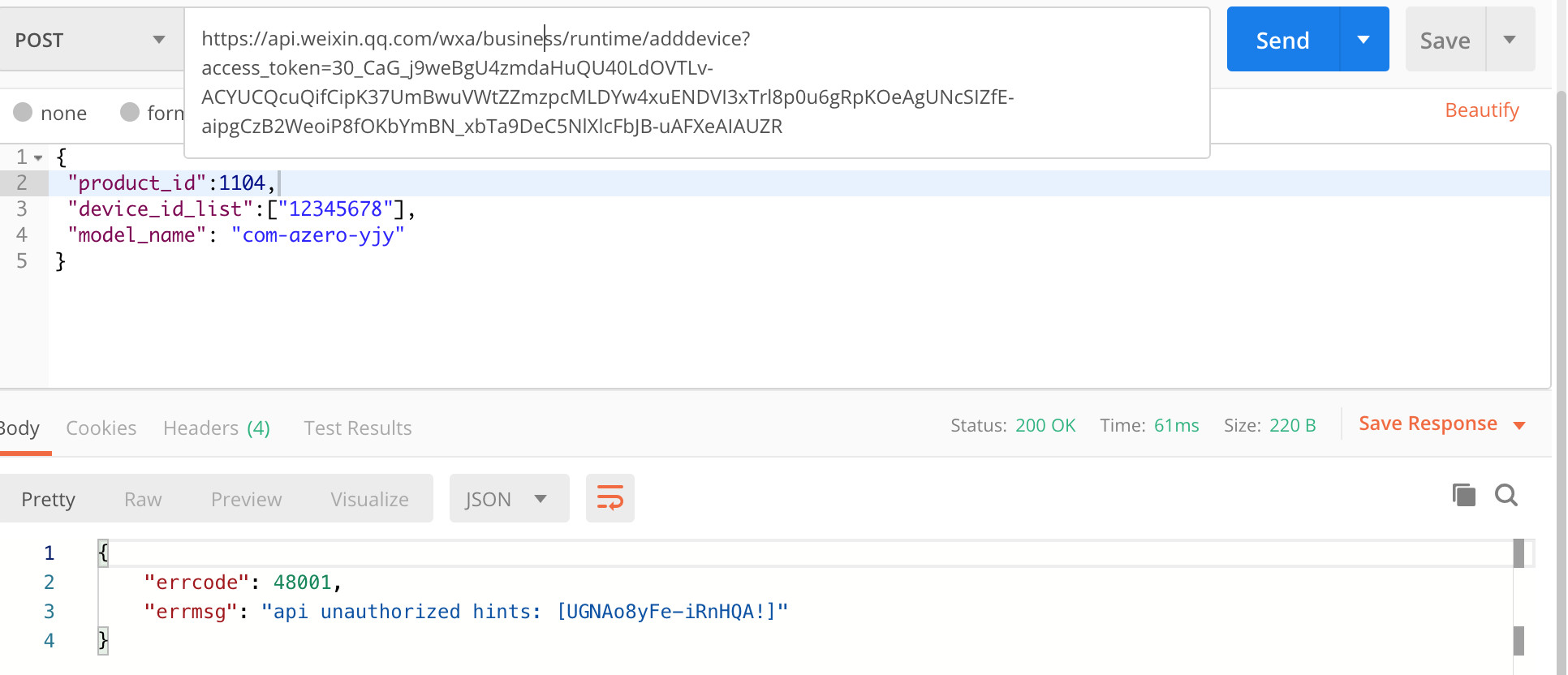 https://api.weixin.qq.com/wxa/business/runtime/adddevice?access_token=30_CaG_j9weBgU4zmdaHuQU40LdOVTLv-ACYUCQcuQifCipK37UmBwuVWtZZmzpcMLDYw4xuENDVI3xTrl8p0u6gRpKOeAgUNcSIZfE-aipgCzB2WeoiP8fOKbYmBN_xbTa9DeC5NlXlcFbJB-uAFXeAIAUZR
