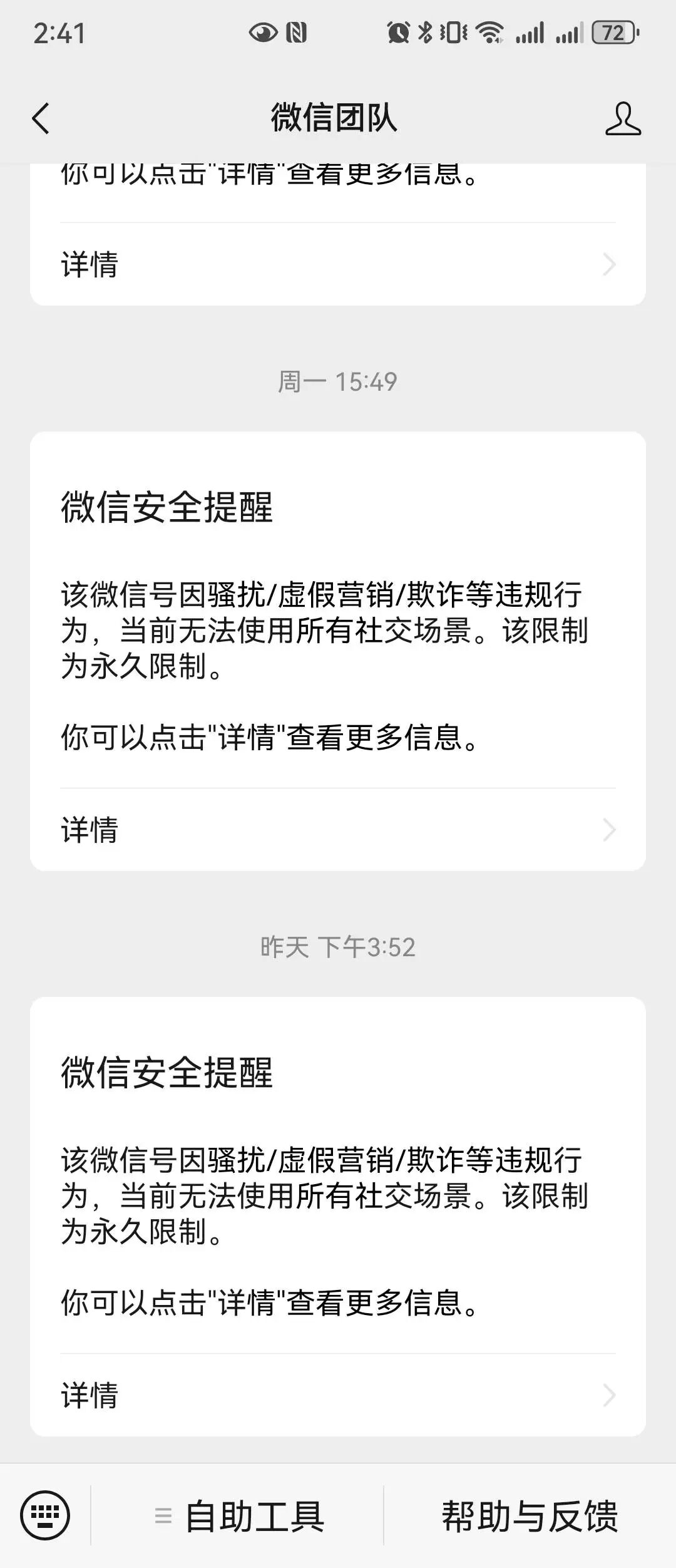 6月11日,账号被突然掉线,上线出现下图一的提示,尝试过申诉,被驳回,打官方客服不下百次,没人接,下图二是找腾讯客服沟通尝试解决问题的过程,沟通无果,想注册个新号使用,但是很多客户说我老微信提示有风险,不愿继续合作,已经严重影响生活工作,说实话挺急的,谁能帮帮我??