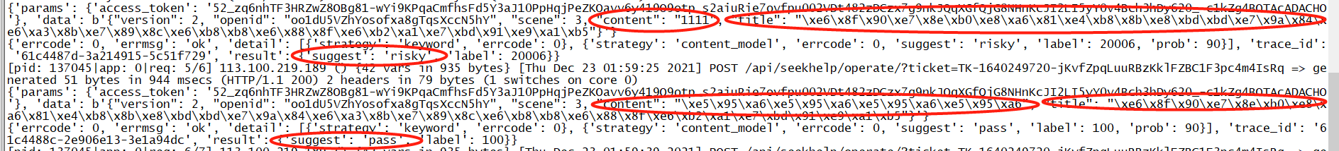 结果打印如下图,前后两次请求,除了content其它无变化,但前面就返回risky,后面的返回pass