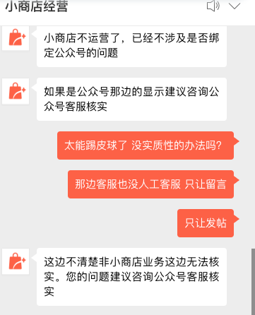 让我找微信小店的客服,他们说也不清楚让找公众号,我再去找原小店的客服,他们那边也让找公众号。都在踢皮球没有一个部门解决问题。还有请认真阅读我的问题!实质性解决问题!