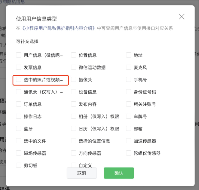排查一下是否有在[mp后台 -> 设置 -> 服务内容声明 -> 用户隐私保护指引]更新【收集你选中的照片或视频信息】,若没有建议尽快补充该隐私类型声明,待审核通过后,过一段时间再试,参考公告:https://mp.weixin.qq.com/s/Vvj5nOTywoj1KlF726XIkg