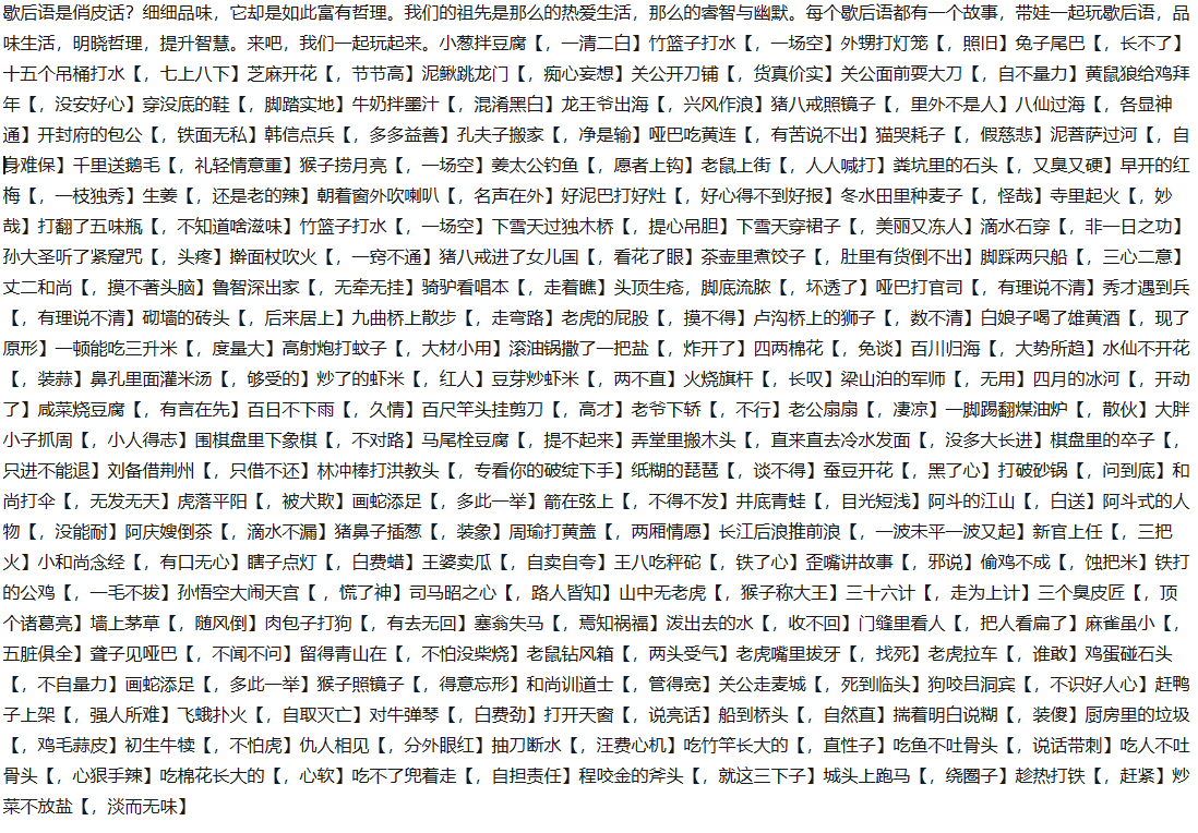 <text>歇后语是俏皮话?细细品味,它却是如此富有哲理。我们的祖先是那么的热爱生活,那么的睿智与幽默。每个歇后语都有一个故事,带娃一起玩歇后语,品味生活,明晓哲理,提升智慧。来吧,我们一起玩起来。小葱拌豆腐【,一清二白】竹篮子打水【,一场空】外甥打灯笼【,照旧】兔子尾巴【,长不了】十五个吊桶打水【,七上八下】芝麻开花【,节节高】泥鳅跳龙门【,痴心妄想】关公开刀铺【,货真价实】关公面前耍大刀【,自不量力】黄鼠狼给鸡拜年【,没安好心】穿没底的鞋【,脚踏实地】牛奶拌墨汁【,混淆黑白】龙王爷出海【,兴风作浪】猪八戒照镜子【,里外不是人】八仙过海【,各显神通】开封府的包公【,铁面无私】韩信点兵【,多多益善】孔夫子搬家【,净是输】哑巴吃黄连【,有苦说不出】猫哭耗子【,假慈悲】泥菩萨过河【,自身难保】千里送鹅毛【,礼轻情意重】猴子捞月亮【,一场空】姜太公钓鱼【,愿者上钩】老鼠上街【,人人喊打】粪坑里的石头【,又臭又硬】早开的红梅【,一枝独秀】生姜【,还是老的辣】朝着窗外吹喇叭【,名声在外】好泥巴打好灶【,好心得不到好报】冬水田里种麦子【,怪哉】寺里起火【,妙哉】打翻了五味瓶【,不知道啥滋味】竹篮子打水【,一场空】下雪天过独木桥【,提心吊胆】下雪天穿裙子【,美丽又冻人】滴水石穿【,非一日之功】孙大圣听了紧窟咒【,头疼】擀面杖吹火【,一窍不通】猪八戒进了女儿国【,看花了眼】茶壶里煮饺子【,肚里有货倒不出】脚踩两只船【,三心二意】丈二和尚【,摸不著头脑】鲁智深出家【,无牵无挂】骑驴看唱本【,走着瞧】头顶生疮,脚底流脓【,坏透了】哑巴打官司【,有理说不清】秀才遇到兵【,有理说不清】砌墙的砖头【,后来居上】九曲桥上散步【,走弯路】老虎的屁股【,摸不得】卢沟桥上的狮子【,数不清】白娘子喝了雄黄酒【,现了原形】一顿能吃三升米【,度量大】高射炮打蚊子【,大材小用】滚油锅撒了一把盐【,炸开了】四两棉花【,免谈】百川归海【,大势所趋】水仙不开花【,装蒜】鼻孔里面灌米汤【,够受的】炒了的虾米【,红人】豆芽炒虾米【,两不直】火烧旗杆【,长叹】梁山泊的军师【,无用】四月的冰河【,开动了】咸菜烧豆腐【,有言在先】百日不下雨【,久情】百尺竿头挂剪刀【,高才】老爷下轿【,不行】老公扇扇【,凄凉】一脚踢翻煤油炉【,散伙】大胖小子抓周【,小人得志】围棋盘里下象棋【,不对路】马尾栓豆腐【,提不起来】弄堂里搬木头【,直来直去冷水发面【,没多大长进】棋盘里的卒子【,只进不能退】刘备借荆州【,只借不还】林冲棒打洪教头【,专看你的破绽下手】纸糊的琵琶【,谈不得】蚕豆开花【,黑了心】打破砂锅【,问到底】和尚打伞【,无发无天】虎落平阳【,被犬欺】画蛇添足【,多此一举】箭在弦上【,不得不发】井底青蛙【,目光短浅】阿斗的江山【,白送】阿斗式的人物【,没能耐】阿庆嫂倒茶【,滴水不漏】猪鼻子插葱【,装象】周瑜打黄盖【,两厢情愿】长江后浪推前浪【,一波未平一波又起】新官上任【,三把火】小和尚念经【,有口无心】瞎子点灯【,白费蜡】王婆卖瓜【,自卖自夸】王八吃秤砣【,铁了心】歪嘴讲故事【,邪说】偷鸡不成【,蚀把米】铁打的公鸡【,一毛不拔】孙悟空大闹天宫【 ,慌了神】司马昭之心【,路人皆知】山中无老虎【,猴子称大王】三十六计【,走为上计】三个臭皮匠【,顶个诸葛亮】墙上茅草【,随风倒】肉包子打狗【,有去无回】塞翁失马【,焉知祸福】泼出去的水【,收不回】门缝里看人【,把人看扁了】麻雀虽小【,五脏俱全】聋子见哑巴【,不闻不问】留得青山在【,不怕没柴烧】老鼠钻风箱【,两头受气】老虎嘴里拔牙【,找死】老虎拉车【,谁敢】鸡蛋碰石头【,不自量力】画蛇添足【,多此一举】猴子照镜子【,得意忘形】和尚训道士【,管得宽】关公走麦城【,死到临头】狗咬吕洞宾【,不识好人心】赶鸭子上架【,强人所难】飞蛾扑火【,自取灭亡】对牛弹琴【,白费劲】打开天窗【,说亮话】船到桥头【,自然直】揣着明白说糊【,装傻】厨房里的垃圾【,鸡毛蒜皮】初生牛犊【,不怕虎】仇人相见【,分外眼红】抽刀断水【,汪费心机】吃竹竿长大的【,直性子】吃鱼不吐骨头【,说话带刺】吃人不吐骨头【,心狠手辣】吃棉花长大的【,心软】吃不了兜着走【,自担责任】程咬金的斧头【,就这三下子】城头上跑马【,绕圈子】趁热打铁【,赶紧】炒菜不放盐【,淡而无味】</text>文字发不出去,只能贴图片了。