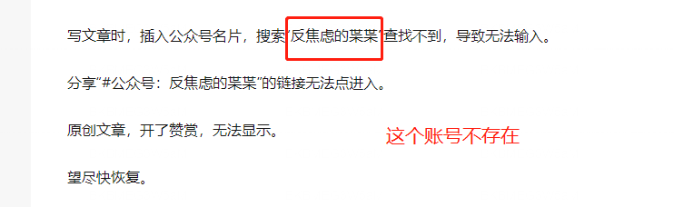 写文章时,插入公众号名片,搜索“反焦虑的枼枼”查找不到,导致无法输入。