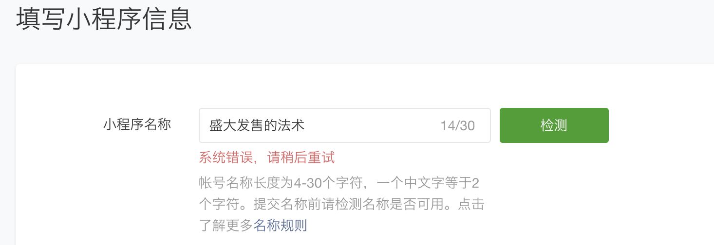 小程序名称 一检测 就提示系统错误并且无法保存提交