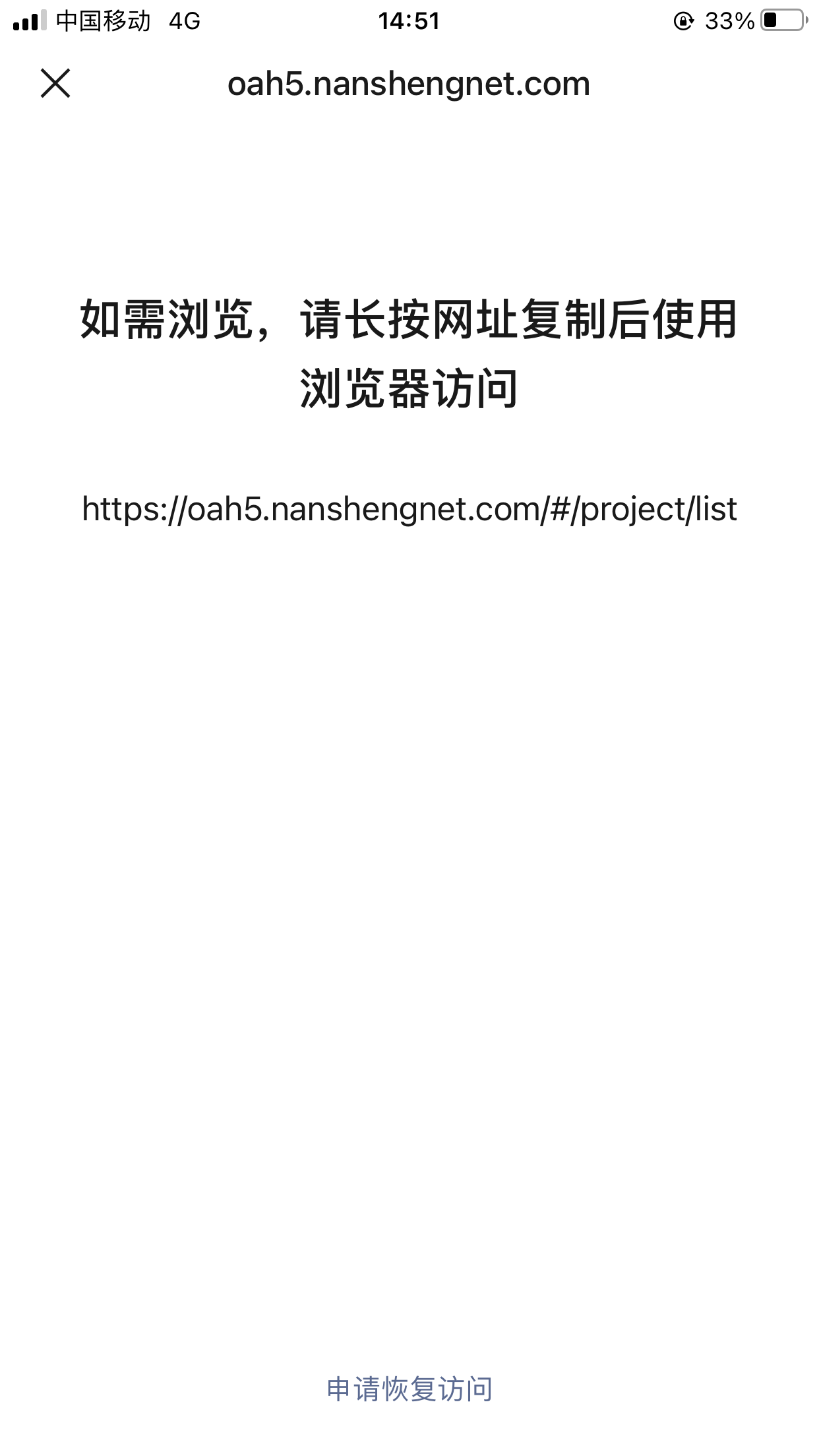3、※现状:部分同事微信内访问系统,或部分同事微信微信内访问系统内某些接口用到二级域名。被提示【“如需浏览,请长按网址复制后使用浏览器访问”】