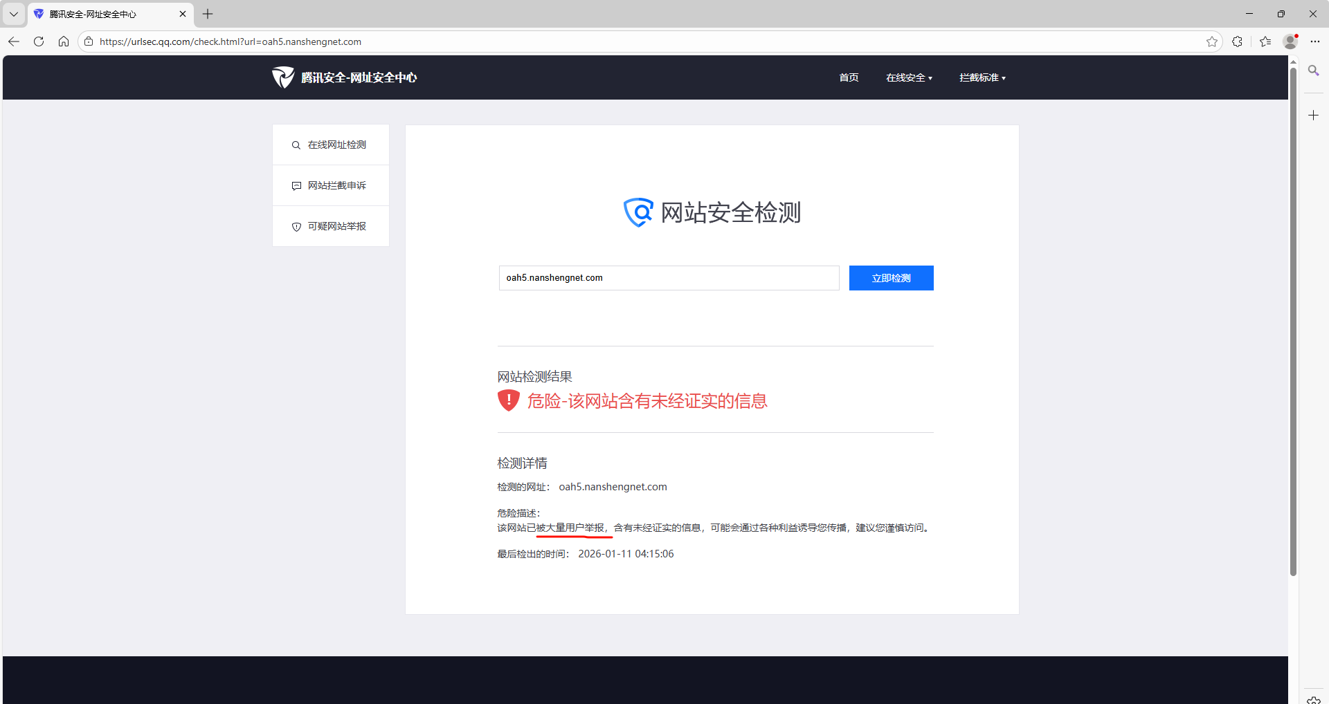 1、本域名为企业内部OA系统,使用者均企业内部,且账户需企业手动创建后才能登入系统。系统并不对外普通互联网用户使用和访问,现在在微信内访问被拦截,在腾讯网址安全中心查询却提示“被大量用户举报”,如为系统误判,望解封。
