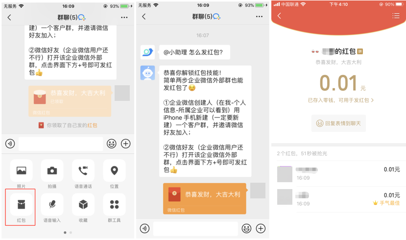 2.目前仅只支持微信客户发红包,企业微信成员还不行