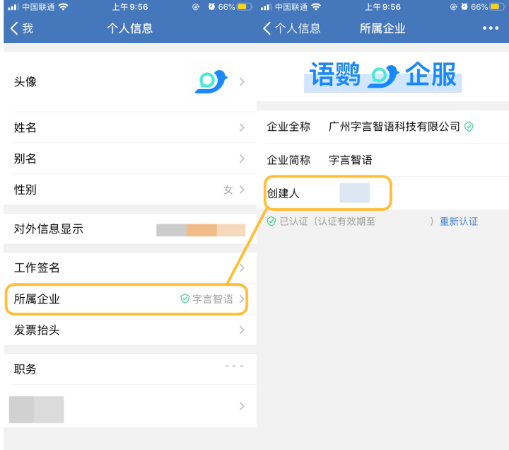打开企业微信App,依次点击【我-个人信息】 页面,点击「所属企业」,可以查看到该企业的「创建人」。
