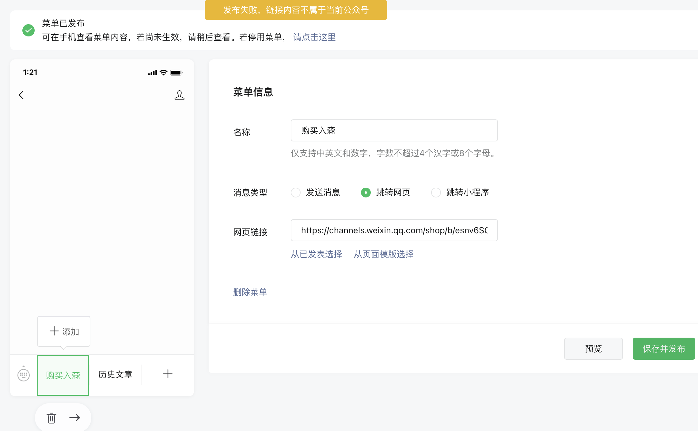 - 确保获取到正确的视频号小店商品或主页链接,然后在公众号后台的“自定义菜单”设置中尝试添加。此时应当能够顺利添加链接,不再出现“链接内容不属于当前公众号”的提示。
