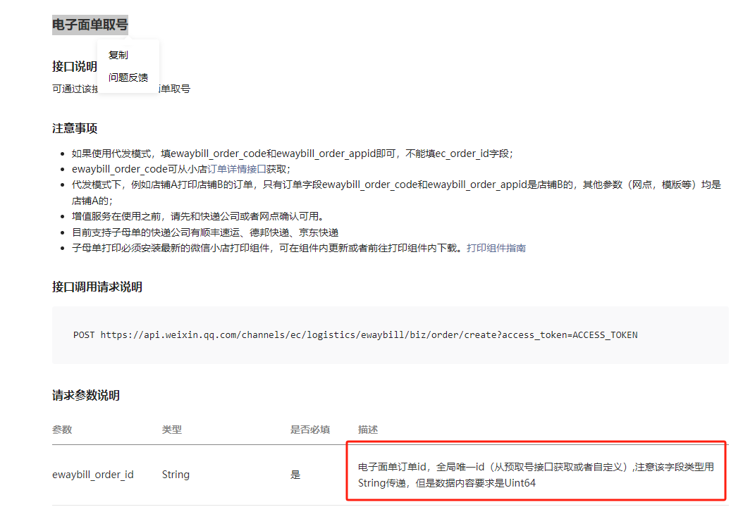 3.返回结果:{"errcode":10025020,"errmsg":"EWaybill Order ID 的数据内容是Uint64,用字符串传递参数,请确认是否正确 rid: 6773ad50-49dea3bb-246547eb","waybill_id_list":[]}