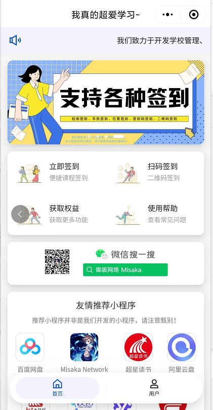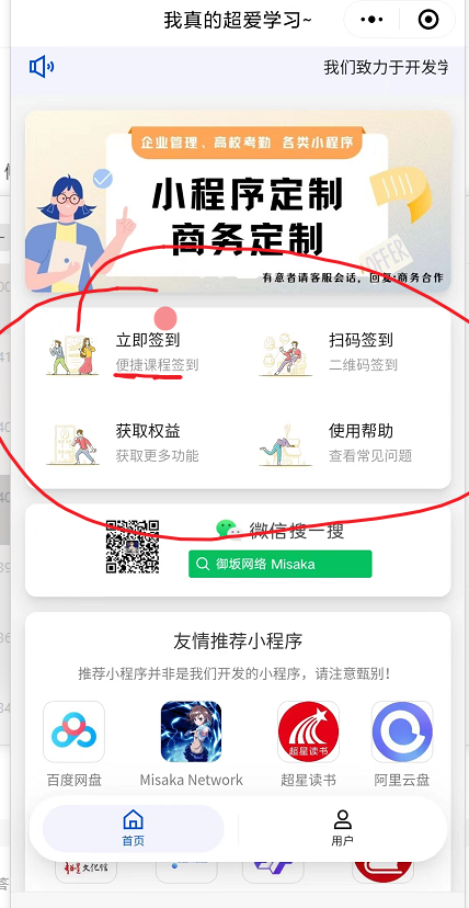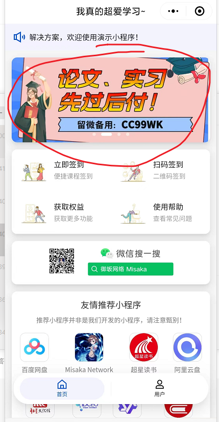 证明:由图可知,小程序为我校学生提供付费学习考试、修改定位签到、无视密码签到、自动获取位置签到、自动签到等服务