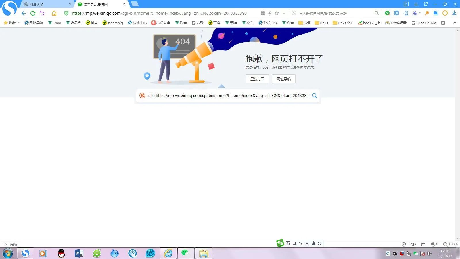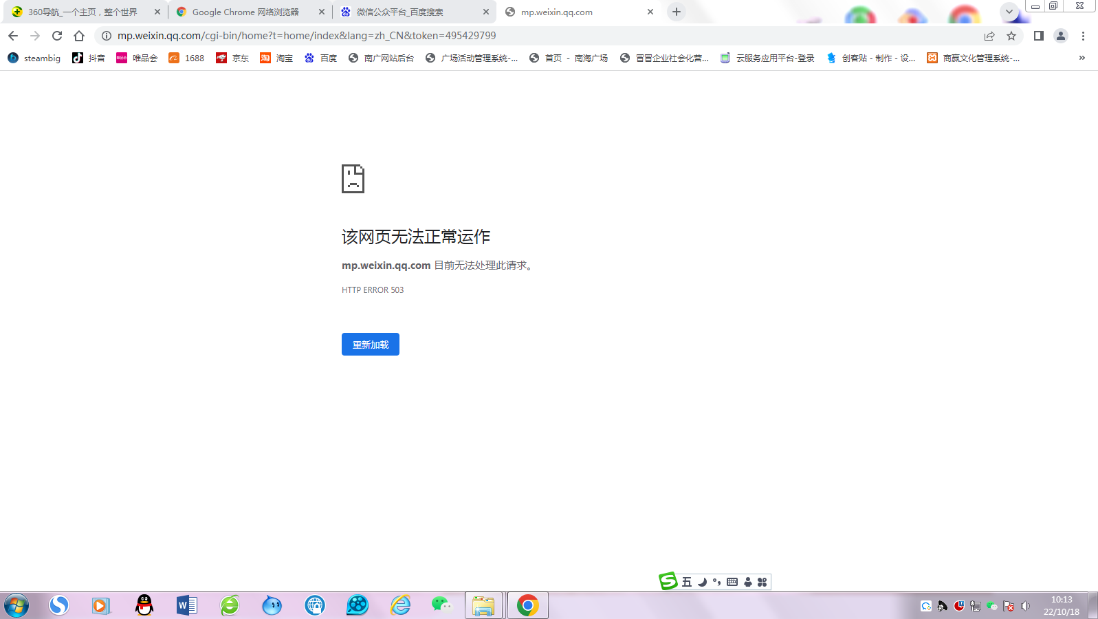 突然无法登录公众号平台,显示HTTP ERROR503网面无法正常运作,求解?9月30日下午,突然无法登录公众号平台,显示HTTP ERROR503网面无法正常运作。偶尔能登录服务号,但订阅号不行。换了6-7个浏览器,换了电脑,换了地方都是这样。请问是什么原因呢?但【订阅号助手】是可以正常使用。当能进去时查找是否有违规提醒,影响使用?但又没有收到相关的通知。