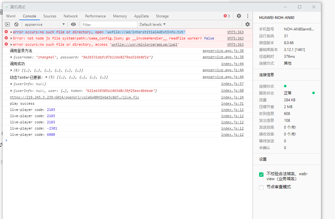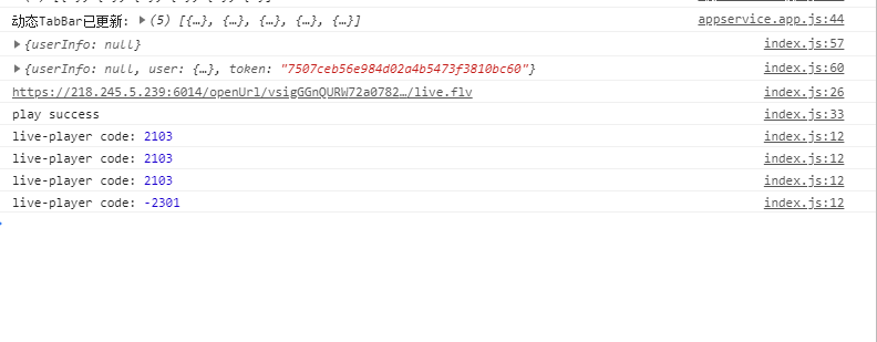 在使用live-player组件,进行连接摄像头播放真机调试时,状态码总报2103和-2301,如下图所示: