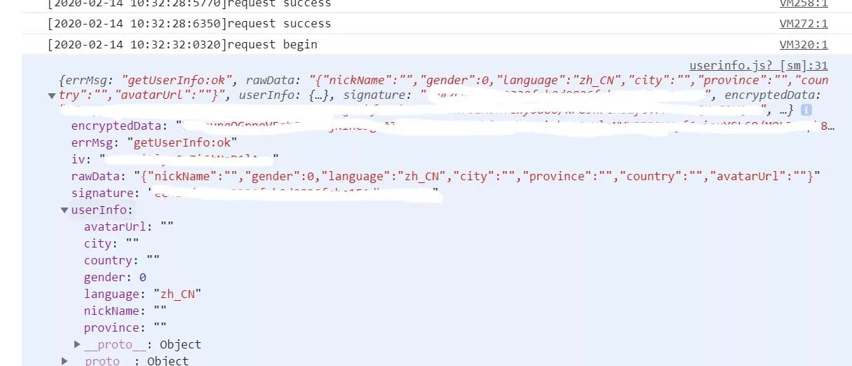 如图: 就是正常的wx.getUserinfo接口, 但是拿取到的用户数据全部为空, ios最新微信版本, 一个同事的手机, 他说最近有修改昵称行为, 不知道是不是和修改昵称有关?