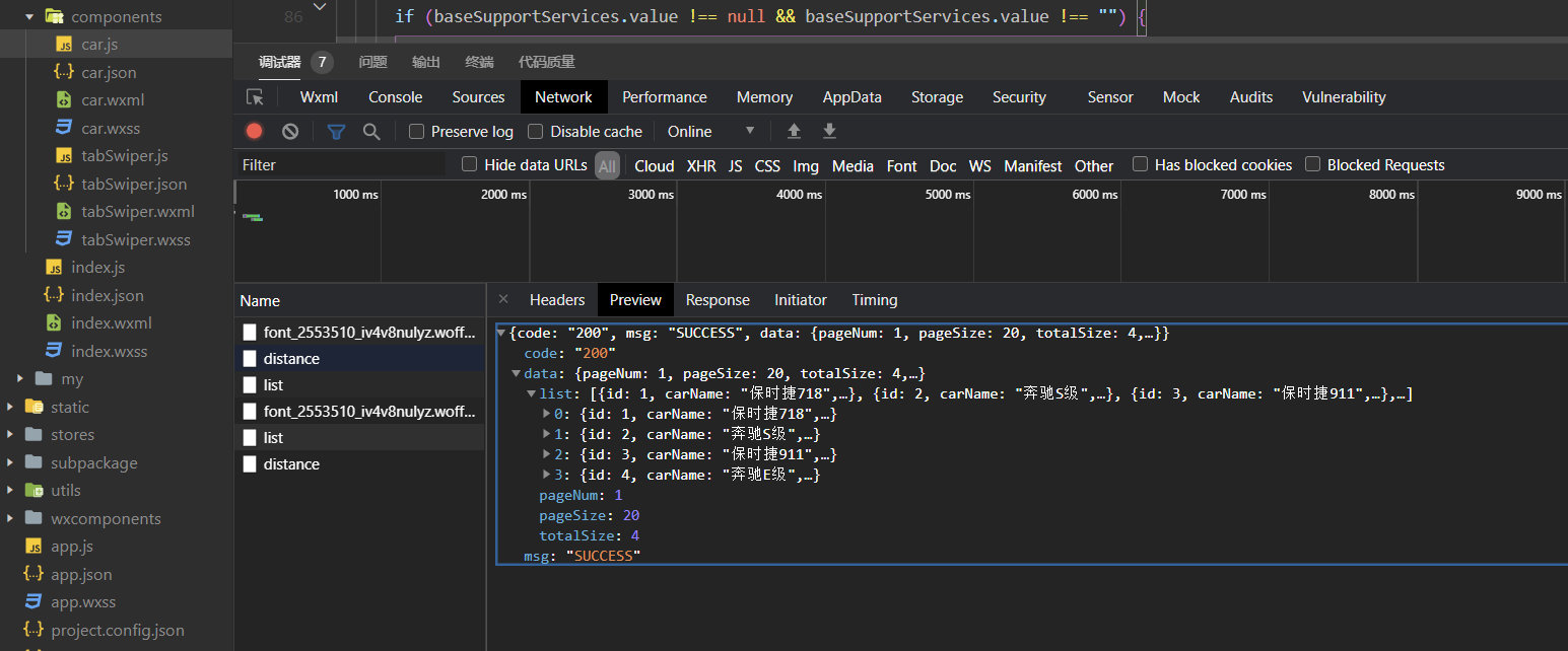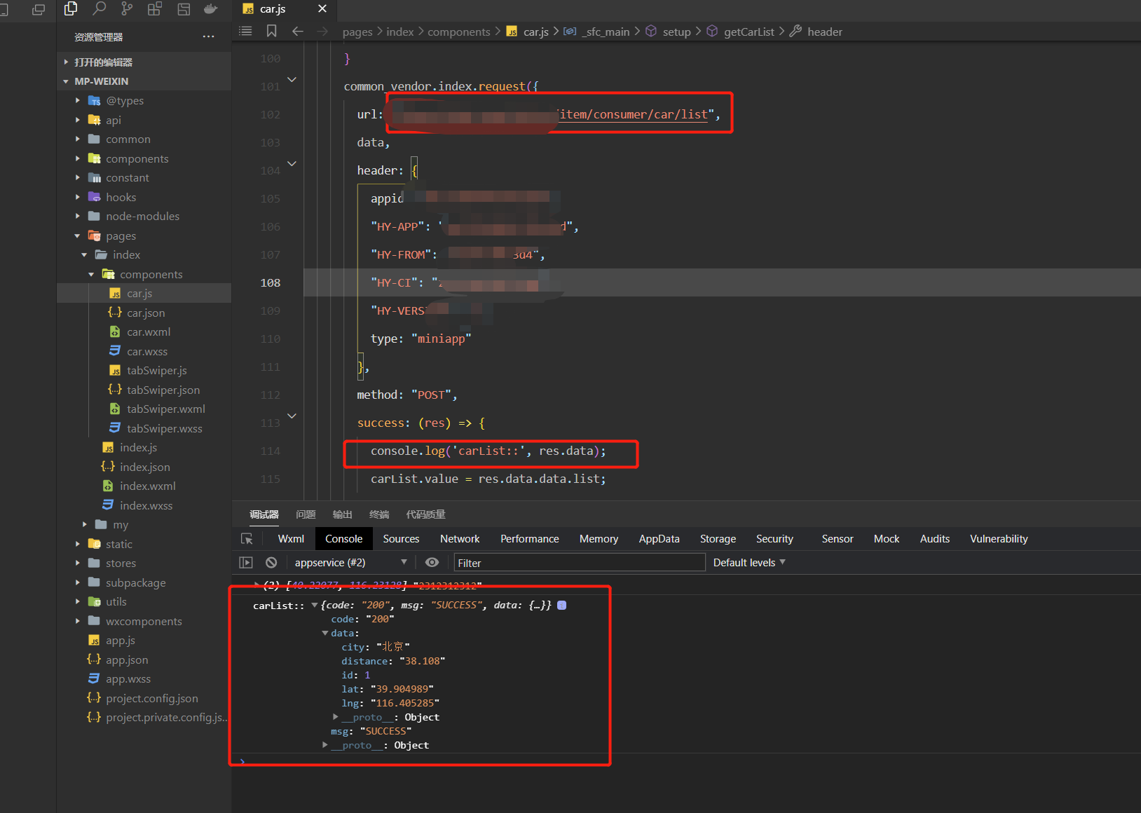 如图1,请求的是 “car/list”,success回调log显示的data,却是另外一个接口的数据。