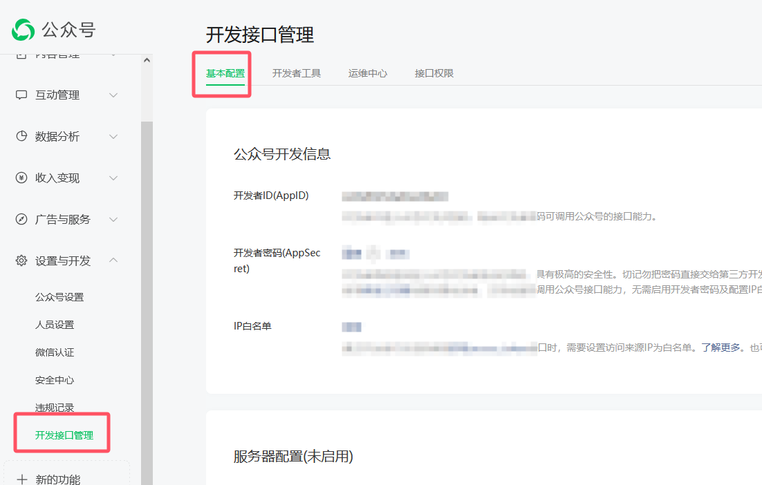 菜单改版了,点击【开发接口管理】菜单就可以看到【几班配置】里面的appid