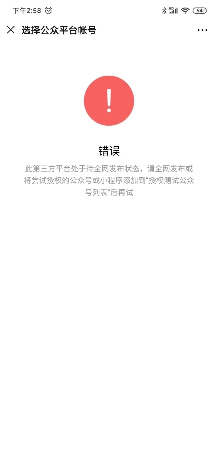 已添加测试公众号原始ID,依旧提示“ 此第三方平台处于待全网发布状态,请全网发布或将尝试授权的公众号或小程序添加到“授权测试公众号列表”后再试 ”。
