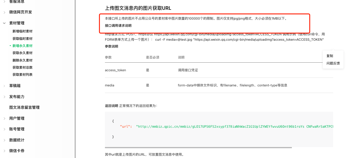 目前根据文档的指引,正常上传素材并获取到图片URL,但是不确定是否有上传图片数量的限制呢(比如100000),现在只能看到限制大小在1M以内。