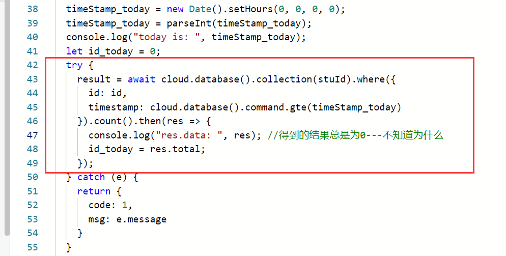 // 云函数入口文件// 获取每一个id对应的点击限制:const cloud = require('wx-server-sdk')cloud.init()// 云函数入口函数exports.main = async (event, context) => { let { id, stuId, userInfo } = event; console.log("id: ", id); id = parseInt(id); let result = null; let id_max = 0; try { result = await cloud.database().collection('maxValueSet').where({ data: { id: id } }).get().then(res => { console.log("res.data: ", res.data[0].data.max_value); //可以得到结果 id_max = res.data[0].data.max_value; }); } catch (e) { return { code: 1, msg: e.message }; }; console.log("id_max: ", id_max); timeStamp_today = new Date().setHours(0, 0, 0, 0); timeStamp_today = parseInt(timeStamp_today); console.log("today is: ", timeStamp_today); let id_today = 0; try { result = await cloud.database().collection(stuId).where({ id: id, timestamp: cloud.database().command.gte(timeStamp_today) }).count().then(res => { console.log("res.data: ", res);//得到的结果总是为0---不知道为什么 id_today = res.total; }); } catch (e) { return { code: 1, msg: e.message } } console.log("id_today: ", id_today); if(id_max > id_today){ return { code: 0, data: "id_max > id_today" } }else{ return { code: 3, data: "id_max <= id_today" } } } |