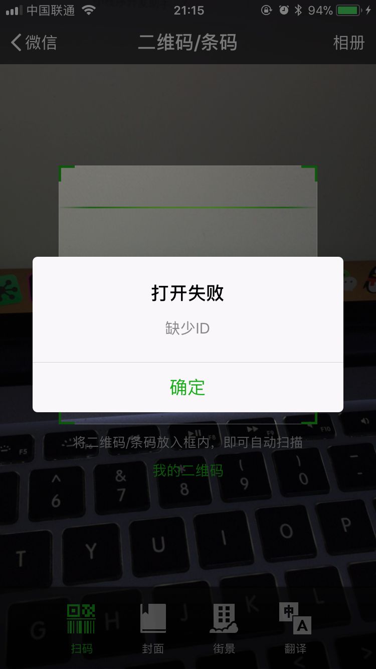 无论线上版本还是开发版本, 扫码均提示打开失败, 缺少ID, 如下图所见, 但是目前该情况仅出现在自己的手机上, 其他人没有出现过, 是不是与升级了IOS11.3测试版有关?