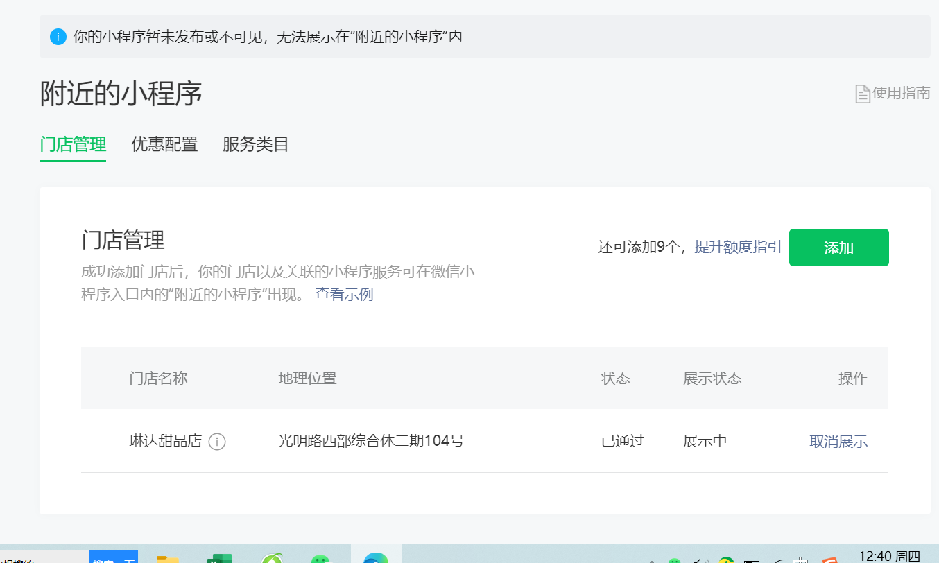 你好,经核实贵司的小程序暂未上架,暂未发布或不可见的小程序无法展示在”附近的小程序“内,建议贵司可先上线相关的小程序。详情参考https://developers.weixin.qq.com/miniprogram/introduction/#%E6%8F%90%E4%BA%A4%E5%AE%A1%E6%A0%B8