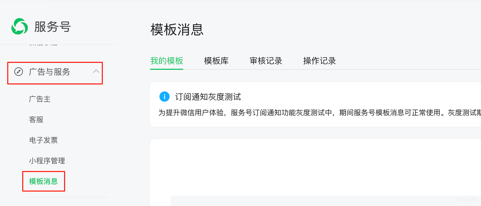 如果需要下发模板消息,要使用【模板消息】功能里面的模板ID,服务号,菜单,广告语服务,模版消息