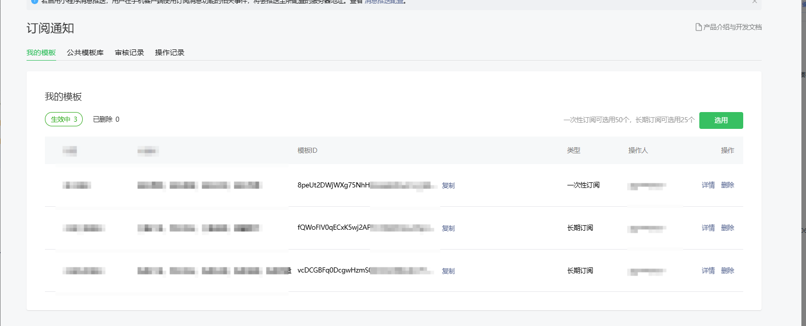 如果需要下发模板消息,要使用【模板消息】功能里面的模板ID。