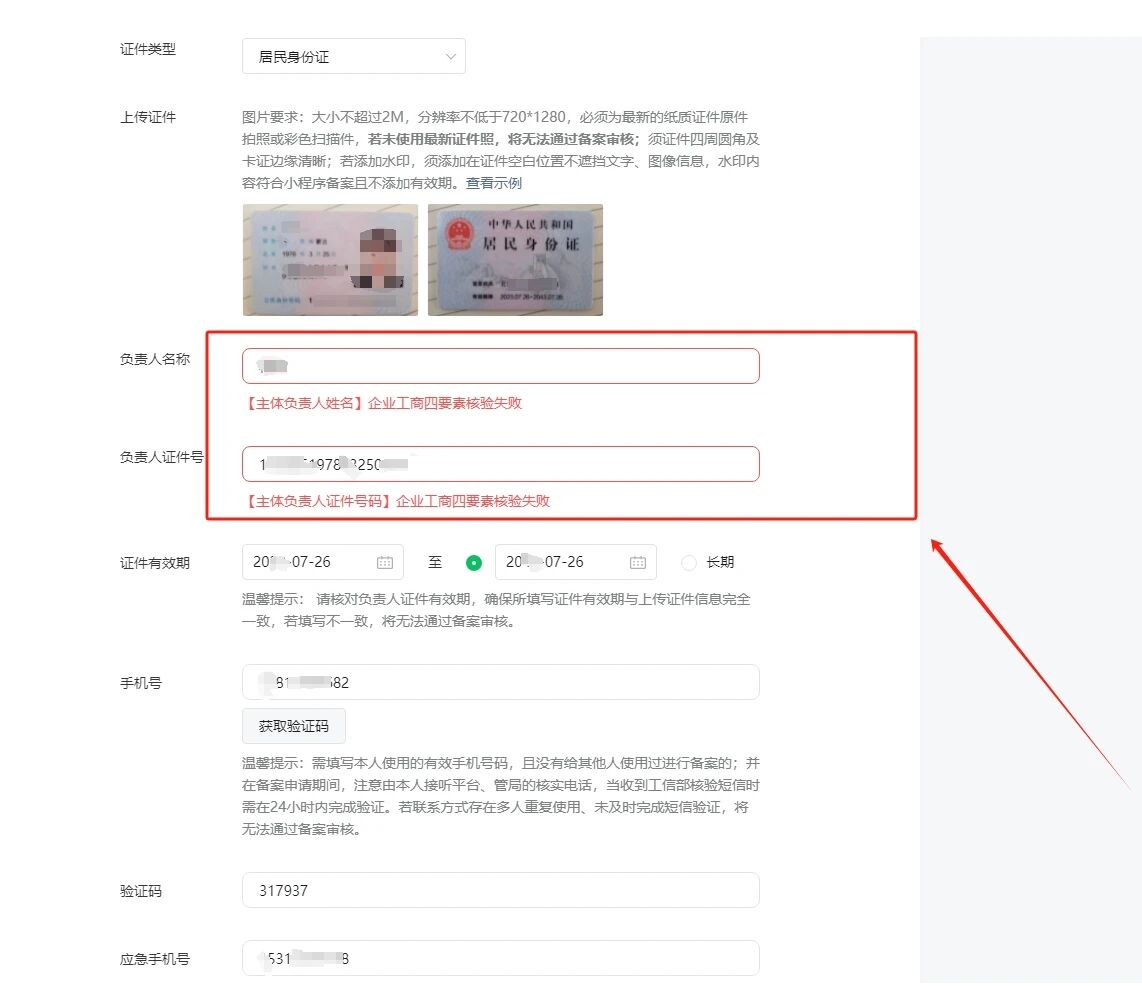 微信小程序提交备案的时候显示“企业工商四要素核验失败”,营业执照是2023年11月办理的的,近期没有做营业执照的任何变更