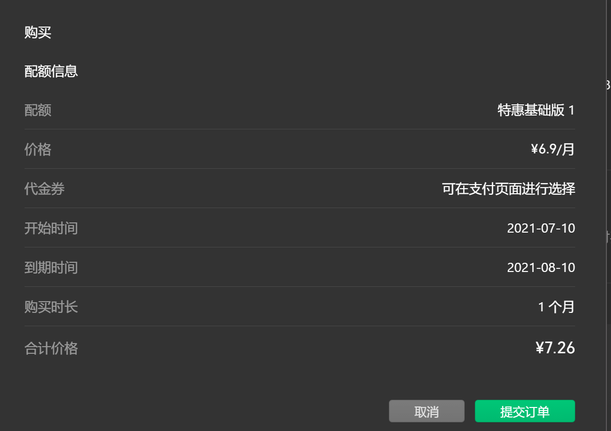 小程序云开发,购买云开发资源套餐,购买的是特惠基础版,上面标的价格为6.9元/月,但是提交订单的时候,却变成了7.26元。实在是不解,有其他收费项,请明示