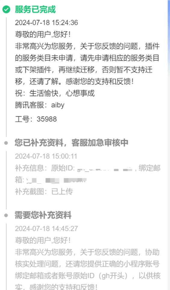 ai客服和人工客服全部文不对题乱答一气,人工客服的答复是插件没申请类目,问题是我现在会卡住就是因为插件有类目并且不能修改但是迁移的时候又必须选择这个类目但这个类目已经不在可选列表导致的!