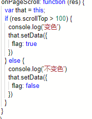 但是我在写的时候我还给加了一个判断,当(res.scrollTop>100&&!flag)时才会触发函数,也就是说只有触发临界值之后才会走一次这个判断内的setData,依然会出现错乱问题。