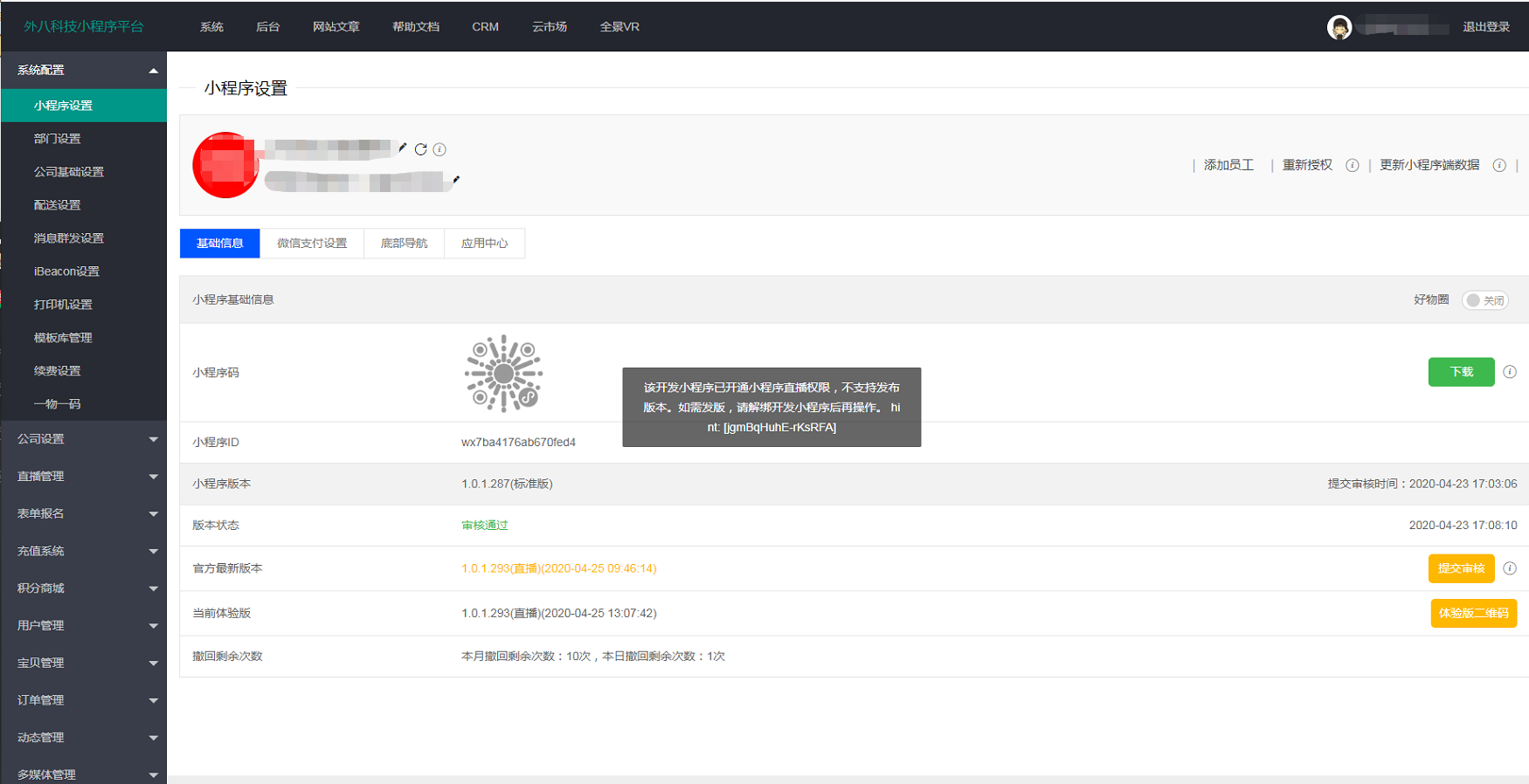 该开发小程序已开通小程序直播权限,不支持发布版本。如需发版,请解绑开发小程序后再操作