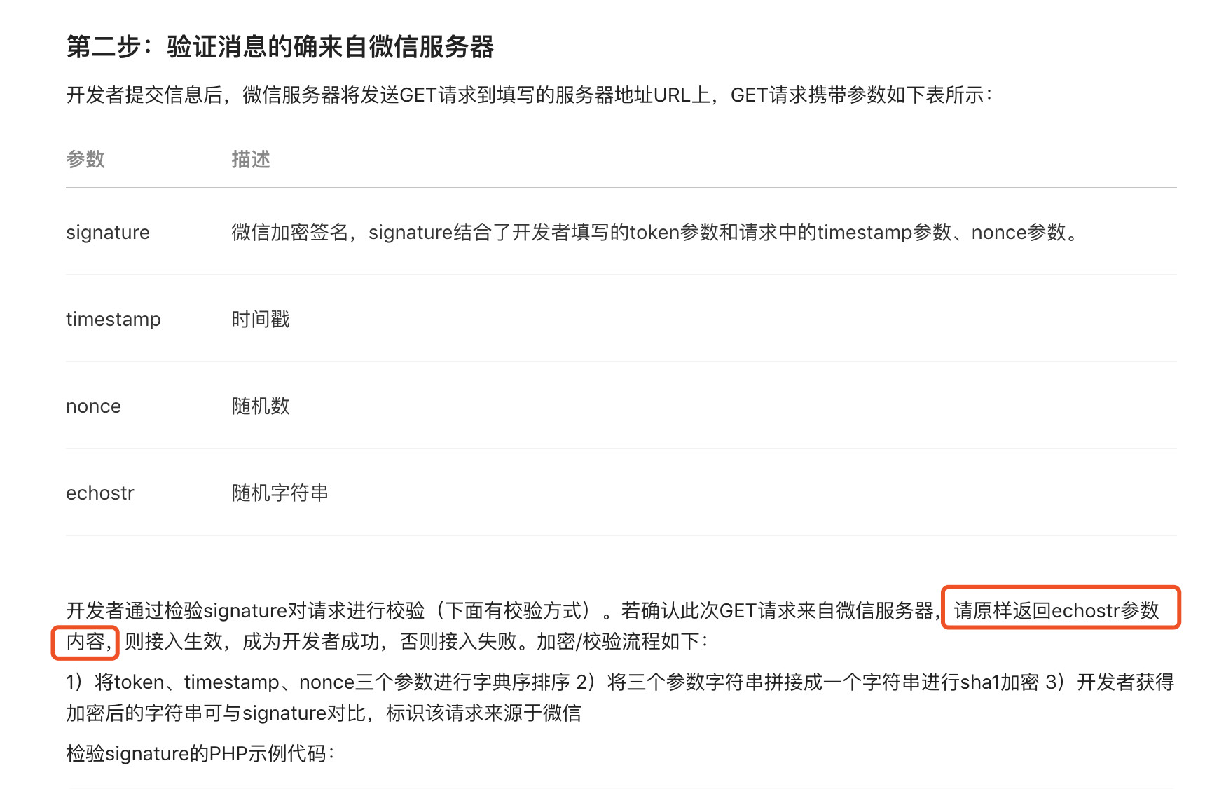 按照微信的文档是需要原样返回 echostr 参数的内容,所以接口最终需要返回给微信 echostr 参数的值