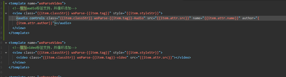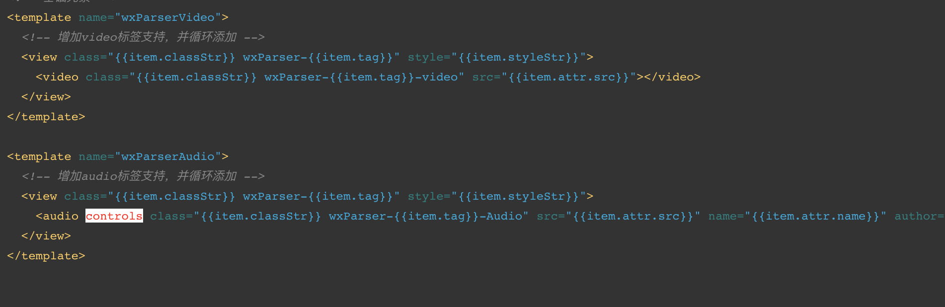 我正好做过 wxParse里面是没有视频标签以及音频标签的 需要自己加 后端返回的标签里面定好video和audio 然后修改index.wxml里面