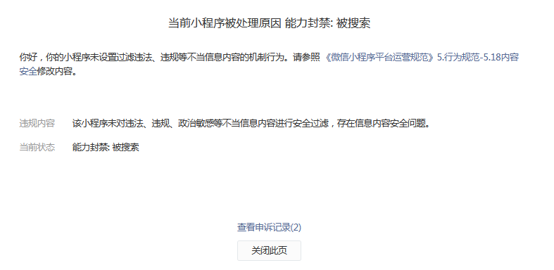 我的也与楼主一样的,我后台加了脱敏了,申请了两次,被拒绝后,就没有申诉入口,太恶心了。难道我经营这么久的小程序就这样被封了?