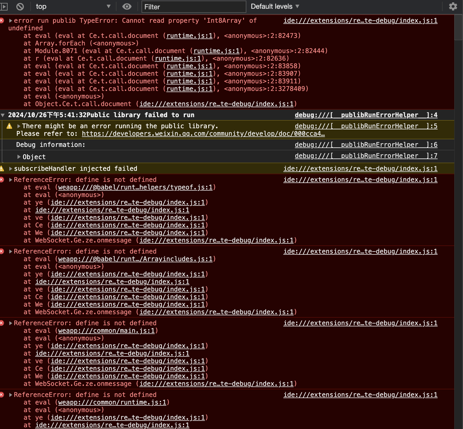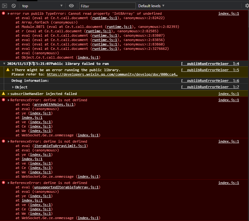 在真机调试时,控制台第一个报错信息是Cannot read property 'Int8Array' of undefined,后面是四个define is not defined的错误。在第一次出现这个问题后,尝试用另一个微信号进行扫码调试还是可以用的。第二天就都不行了。原本用的是稳定版的,后续尝试过卸载重装RC的,还是不行。求大佬指教555