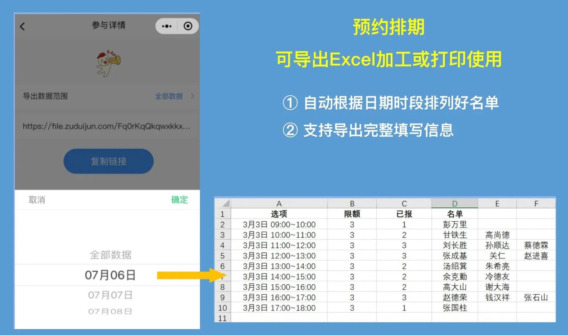 ⑥ 数据管理&导出:所有的预约数据及信息都可以导出为Excel文档,文档可以按照日期时段展示名单,数据可以任意下载保存及自行加工后使用。