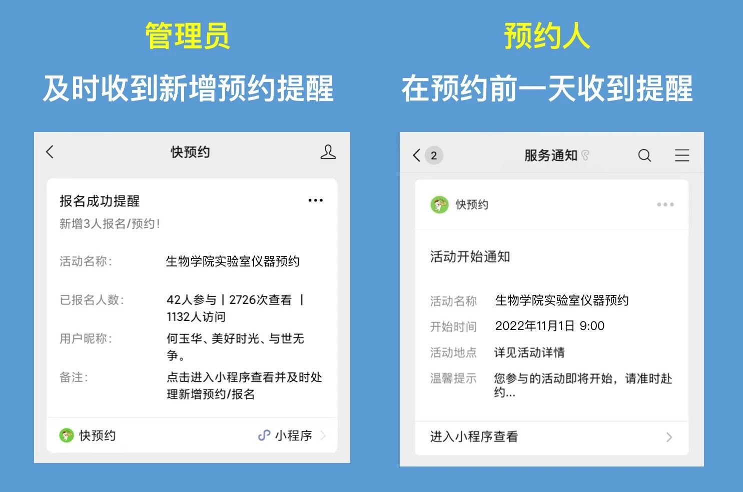 ④ 消息提醒:新增预约后,管理员可及时收到新增预约通知,可提前进行相应的仪器借用的准备;预约者也将在预约开始前收到自动提醒。